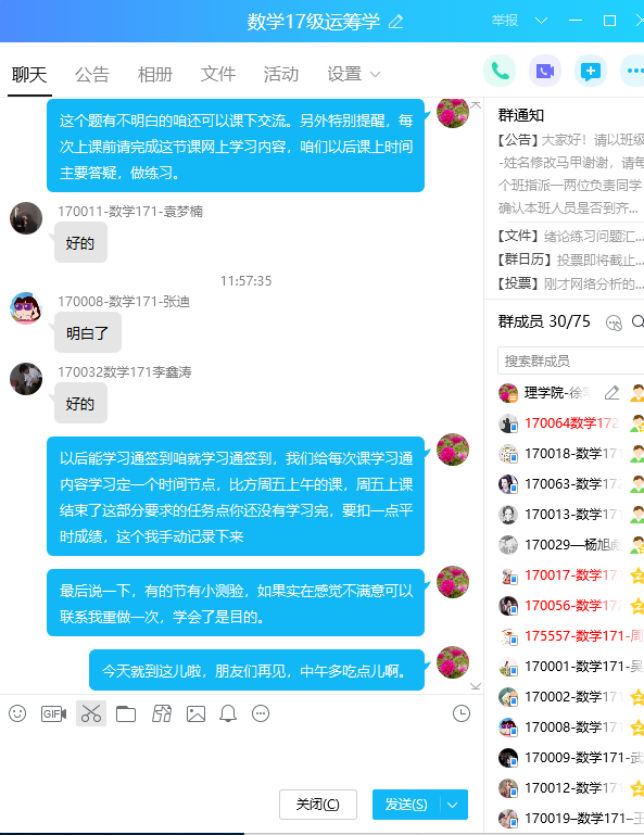精“辛”准备。自1月31日学校组织在线教学培训以来,全院教师活跃在学校构建的三大平台的各个微信群,学习掌握在线教学技能。青年教师一马当先,老教授也不甘落后,老师们以课程为单位组建团队制作教学辅导视频,搜集整理在线教学资源,交流分享在线教学小妙招,适应线上教学更新完善PPT,公共教研室提前选定教学资源、上传教学视频和教学资料,与学生班级建立QQ群、微信群,保障沟通渠道畅通。针对触“网”不多的老教师,教研室安排网课高手与其结对子携手并进。大学物理教学中心汪大云老师面向全校两次举办示范课,2月5日《大学物理A》在线观摩,全校有656名教师和32名学生共享空中课堂。