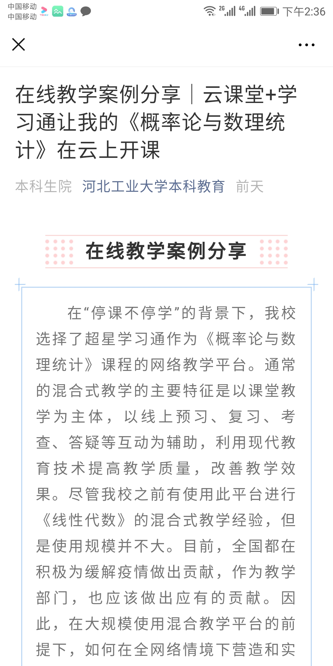崭“新”上课。线上教学一周来,老师们在河工云课程、学堂在线、中国大学MOOC、腾讯课程、智慧树,并结合QQ群、微信群、腾讯会议等多个平台开展在线教学。有的老师使用直播教学,有的老师采用翻转课堂,有的老师使用MOOC+网上辅导,有的老师使用平台+QQ互动,为提高教学效果不断进行探索,并及时分享自己好的教学模式和小妙招,顺利实现了从三尺讲台上的“教书匠”到“教学网红”的华丽转身。