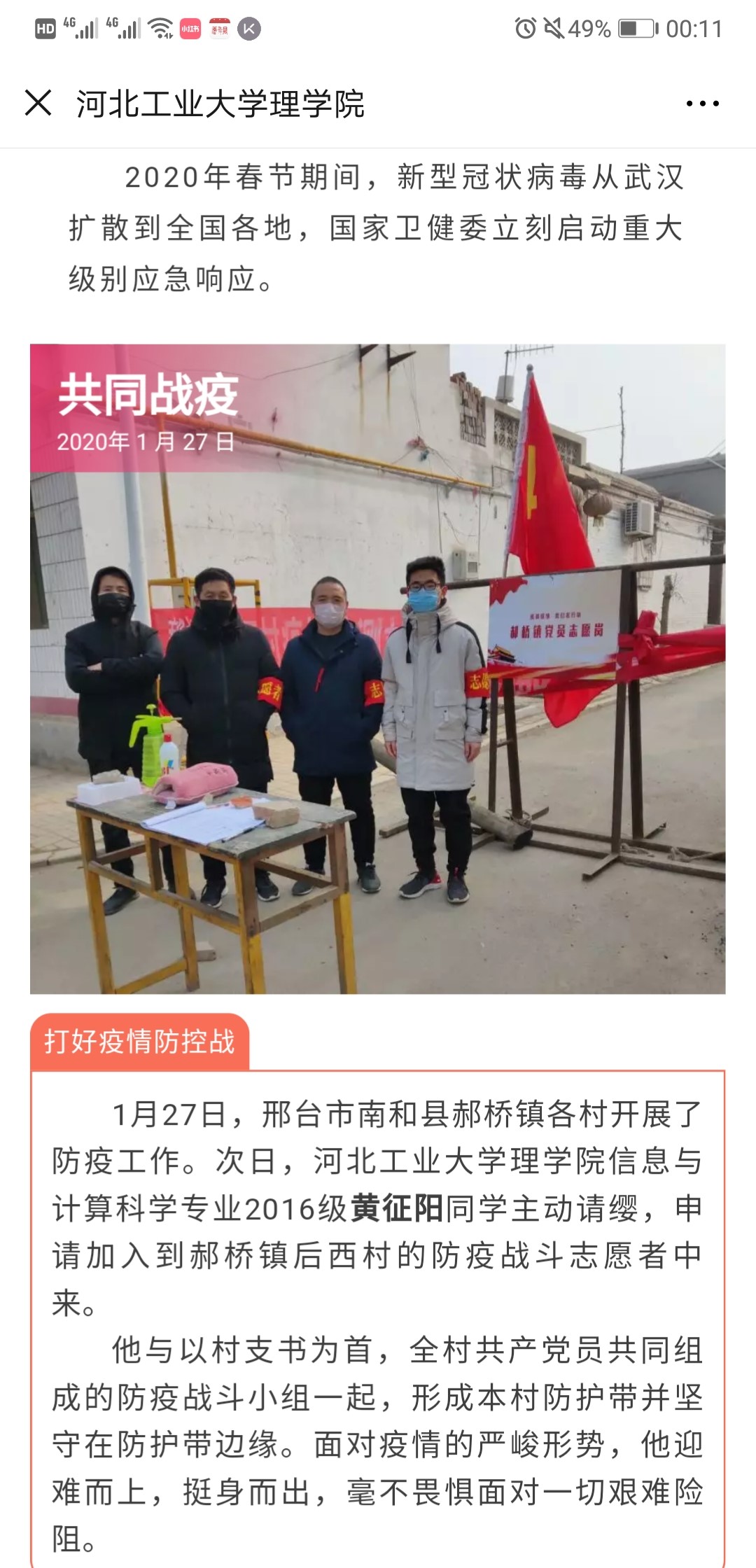 疫情防控以来,学院涌现出以信计162班黄征阳为代表的一批逆行青年,他们主动请缨投入到家乡所在地的疫情防控工作,充当疫情防控志愿者,体现了我院大学生的责任与担当。