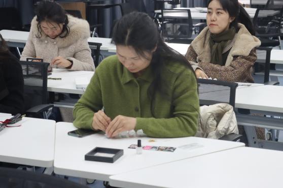 在镶嵌体验环节,女教职工们充分发挥创意,精心挑选底胚,用镊子夹起螺钿片,小心翼翼地镶嵌在木胎上。