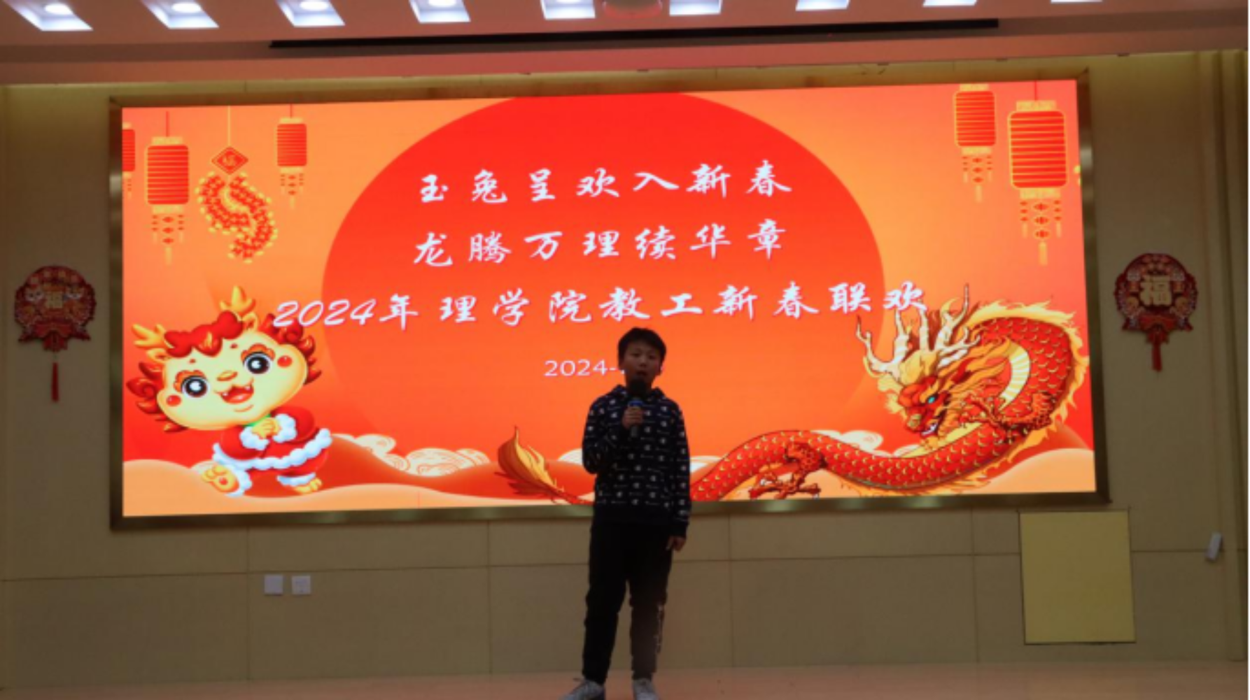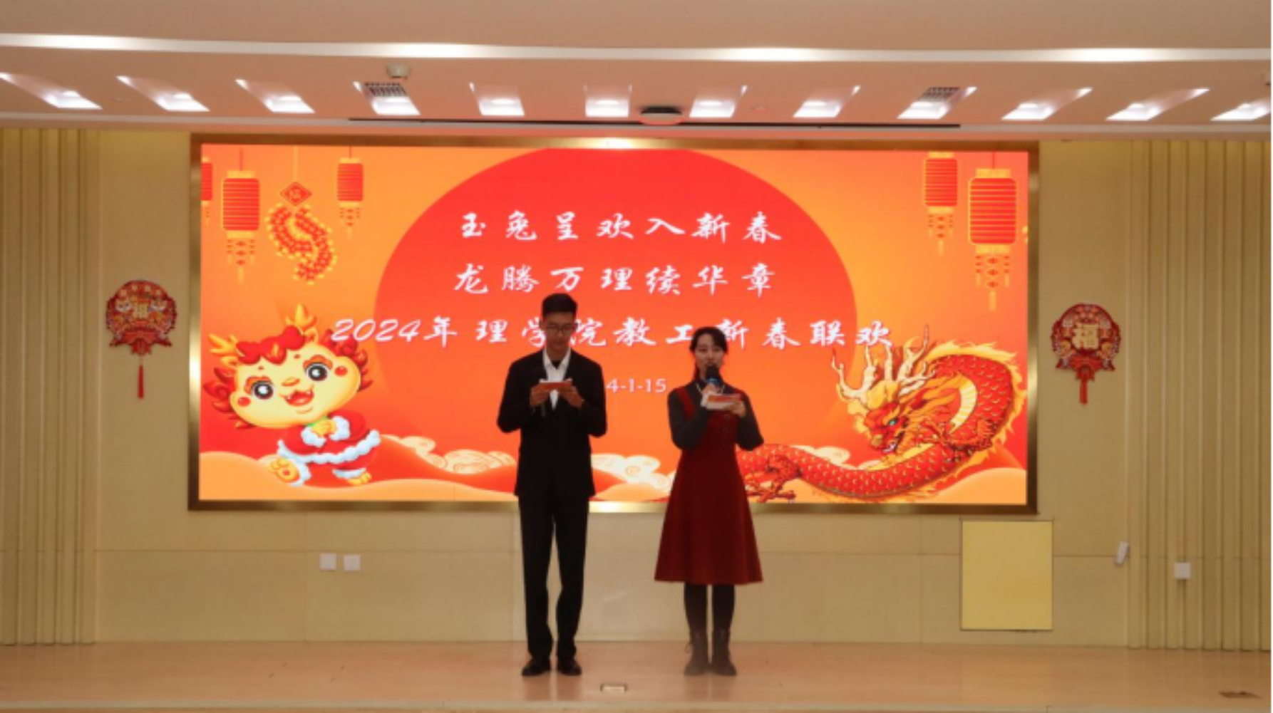 为迎接崭新的2024年、激发学院教职工团结奋进精神,理学院于1月15日在图书馆报告厅第三会议室举办“玉兔呈欢入新春,龙腾万理续华章”2024年新春联欢会,学院党委书记何华、党委副书记兼副院长张旭、副处级辅导员张培培参加了活动,联欢会由辅导员王湜湿、高士钧主持。