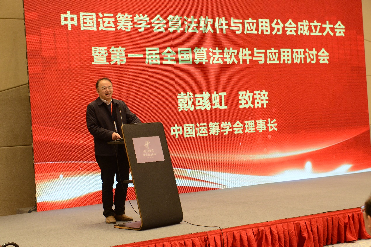戴彧虹理事长代表中国运筹学会祝贺大会胜利开幕,对承办单位的辛苦付出表示感谢。他指出,算法软件与应用分会是学会第17个分会,分会的成立是运筹学界与业界融合发展的一个里程碑,也是中国运筹学会的一件大事。成立算法软件与应用分会,将架起理论与应用的桥梁,打造从运筹学理论到应用的完整生态链。