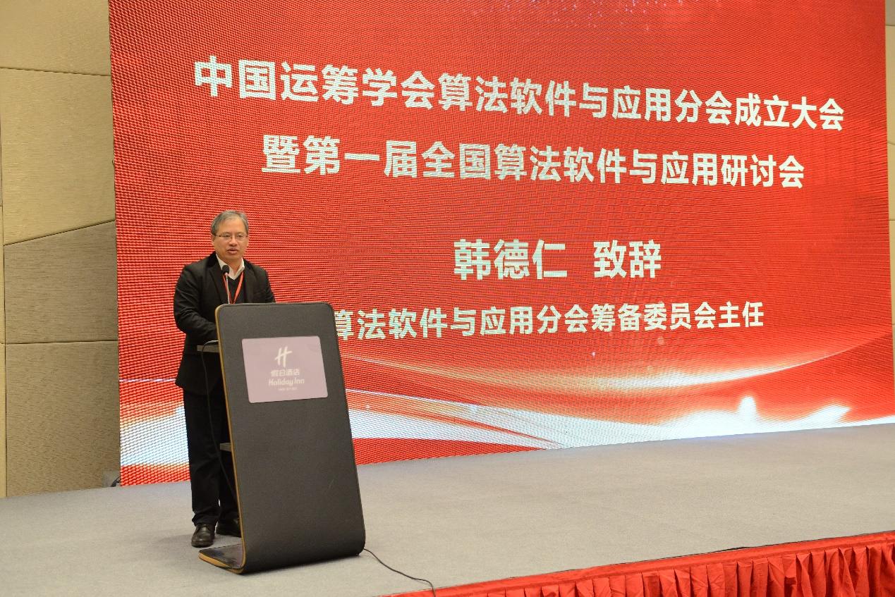 韩德仁主任介绍了算法软件与应用分会成立的背景,并表示分会有三新:新的理念、新的成员和新的规矩。分会将以算法为核心,以软件为桥梁,以解决实际应用问题、服务国家战略需求和为国计民生贡献运筹学力量为目标。