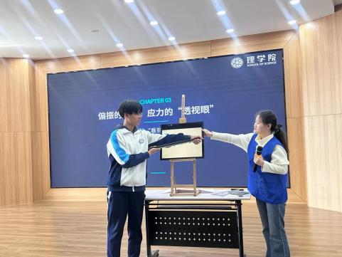 转入偏振光的秘境,史悠然同学以马吕斯定律编织光影叙事。随着偏振片转动,“两暗两亮”的规律直观呈现。一把寻常三角尺在偏振光下绽放彩虹应力条纹,注塑成型中隐藏的内应力被光一一唤醒。同学们登台操控偏振之舞,体悟科学与未知的对话。