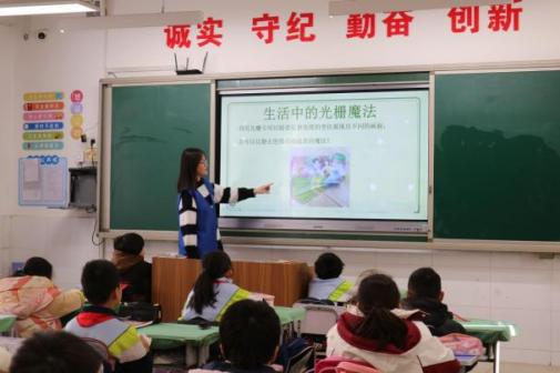 团队成员分工协作,将专业知识转化为直观体验。“神奇偏振镜”前,孩子们紧盯镜片,看着光线随旋转明暗交替,惊叹声此起彼伏。队员结合3D眼镜、偏光太阳镜,以“光线筛选器”为喻拆解原理,让抽象知识落地,孩子们直呼解锁了身边的科学密码。光栅分光实验则上演了一场色彩魔法,普通白光穿过光栅片,瞬间化作七彩光谱,宛如彩虹坠入课堂。孩子们争相观察、分享发现,求知热情拉满,科学的种子在这份好奇中悄然萌发。