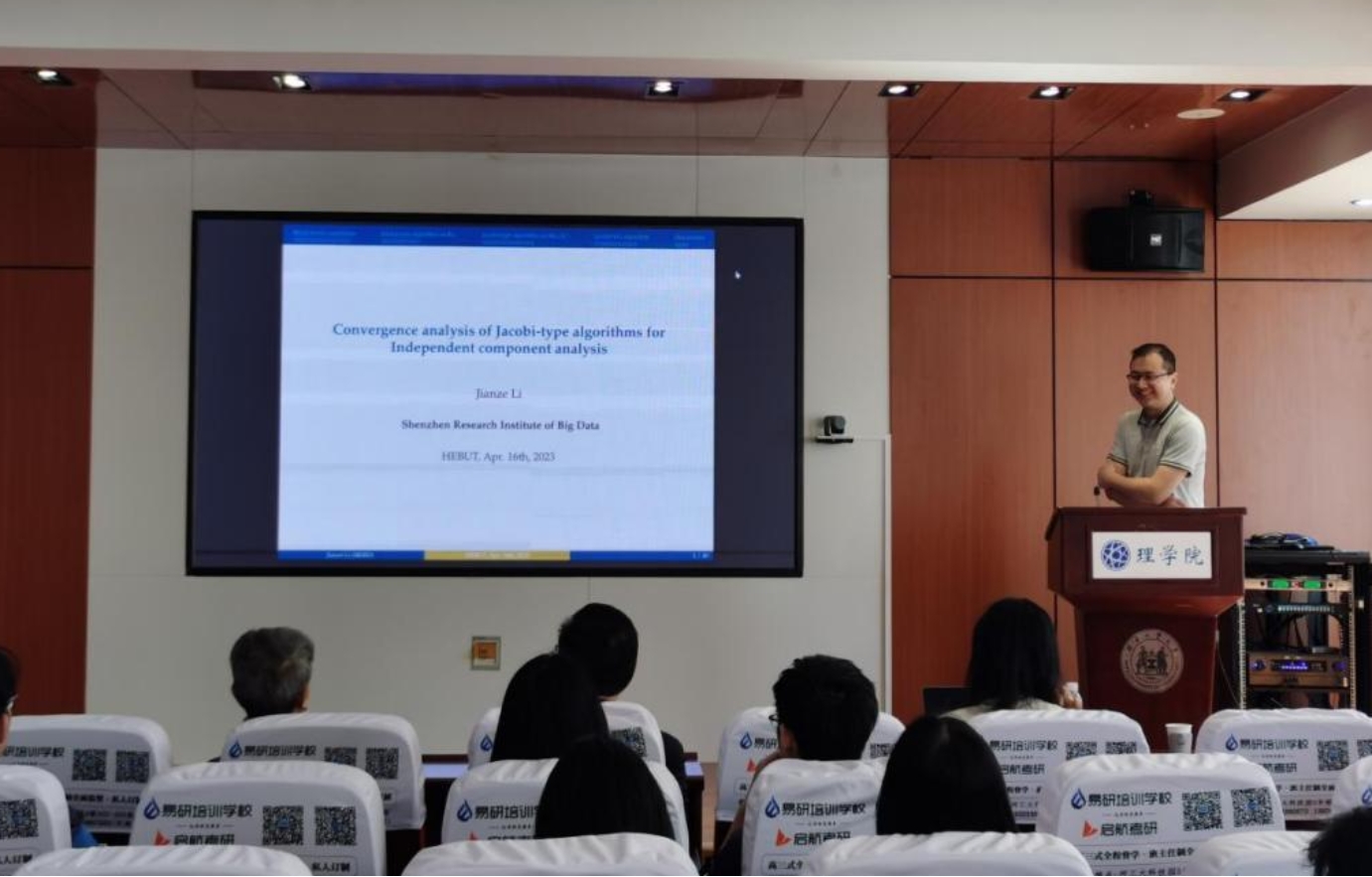4月16日,深圳大数据研究院研究员李建泽博士及香港科技大学(广州)助理教授刘李博士受邀来我院作学术报告,报告题目分别为“关于Jacobi类型ICA算法的收敛性分析”、“人工智能小样本迁移学习的统一量化框架研究”,报告于西教四216召开,由学院党委书记何华主持,我院教师代表和研究生们参加了报告。