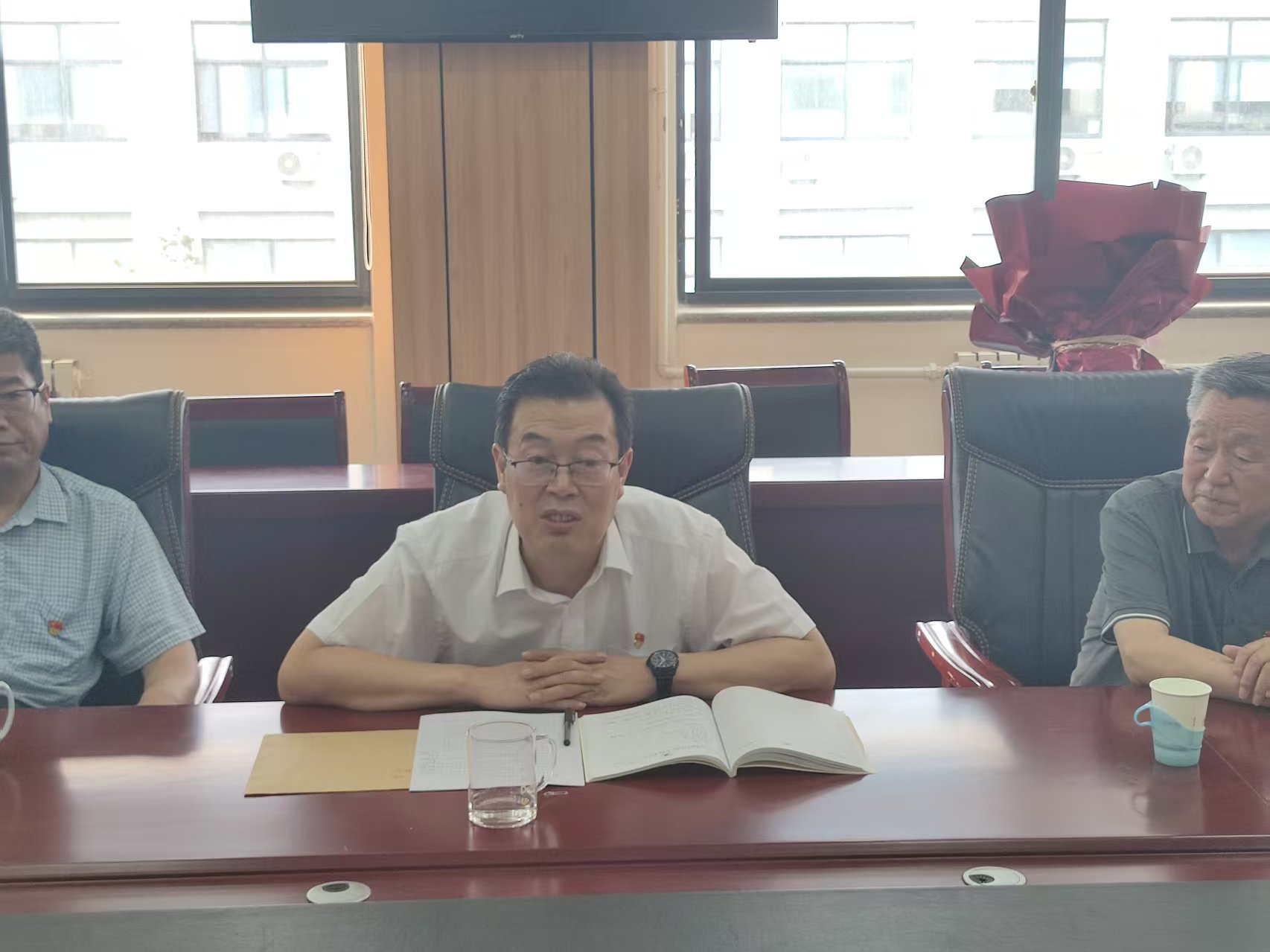发言结束后,青年党员教师代表王素敏、学生党员代表郝宁为两位老先生献花,何华书记为老先生们颁发政治生日卡。