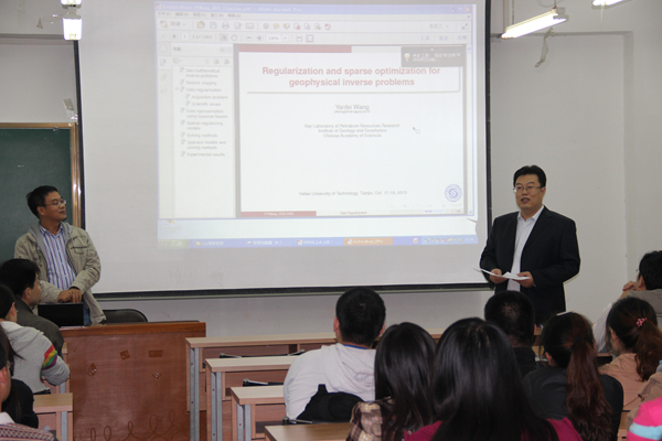 2013年10月18日下午2:00,应理学院邀请,我院“97级应用数学硕士,中科院地质与地球物理研究所,王彦飞研究员”和“数学97级校友,中央财经大学中国精算研究院副院长,周明研究员”,借110周年校庆之际返回母校,在理学院416教室做学术交流。此次交流活动,由副院长何华教授主持,大概有50名教师和硕士生参加。