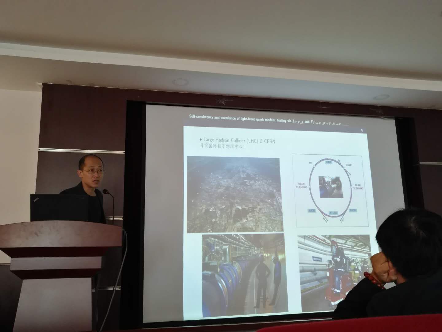 报告中,常钦教授介绍了高能粒子物理的前沿问题和全球范围内的重要高能基地,围绕光前夸克模型的协变性和自洽性报告了本人(课题组)的最新研究成果。