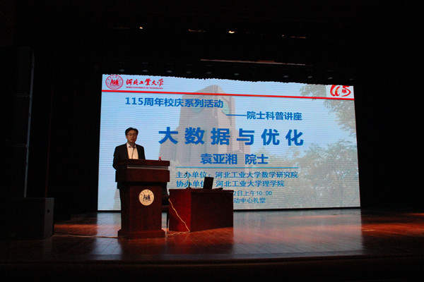 4月22日上午十时,国家自然科学基金委数学天元基金领导小组组长、中国科协副主席、中国数学会理事长、国际工业与应用数学联合会主席、中国科学院院士袁亚湘来到我校,在北辰校区大学生活动中心礼堂为师生作了“大数据与优化”的报告。报告会由校党委常委贺立军同志主持,理学院和人工智能与数据科学学院近千名师生聆听了报告。