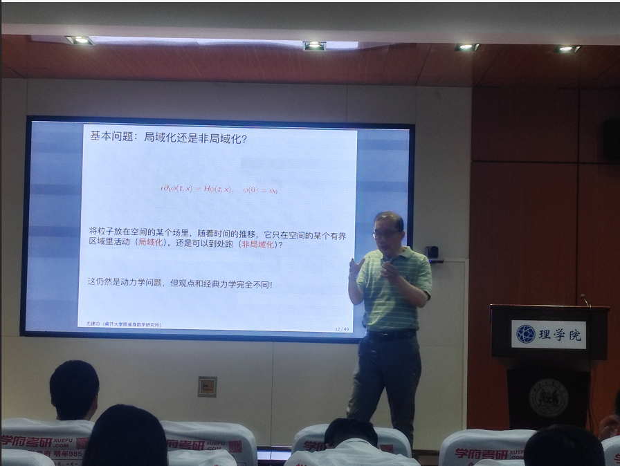 然后,尤建功教授报告指出,量子力学的基本方程是线性薛定谔方程,是用不同的观点对客观世界的更底层描述。局域化还是非局域化是这个领域的基本问题,动力系统的理论和方法可以深度卷入量子物理相关问题的研究。通过量子霍尔效应、准晶、和拓扑绝缘体中出现的数学模型,尤建功教授进一步地详细介绍了量子物理、算子谱理论,薛定谔方程和动力系统之间的深刻联系,并强调了物理直觉在数学研究中的重要性,数学思维对发现反物理直觉现象的重要性,以及科学对数学提供问题,刺激新理论和新方法的产生,改变思维方式和研究范式等影响。