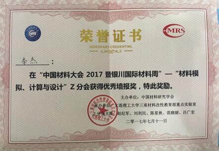 7月9-12日, 在宁夏银川举办的“2017年中国材料大会暨银川国际材料周”上,我院李佳老师的研究生李杰同学的“The thermoelectric properties of predicted semiconducting Ti2CrX(X='Ge,Sn)' and Sc2FeX(X='Si,Ge)